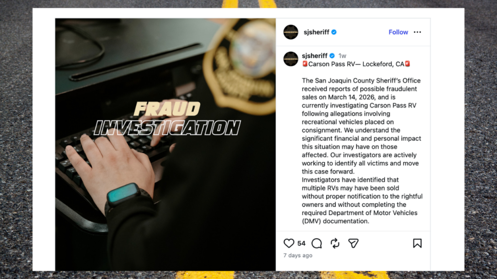 According to local reporting, some RVs are still on the dealership property, while others have already changed hands. The sheriff’s office is also working with the California DMV as investigators try to sort out ownership and registration issues tied to the dealership.